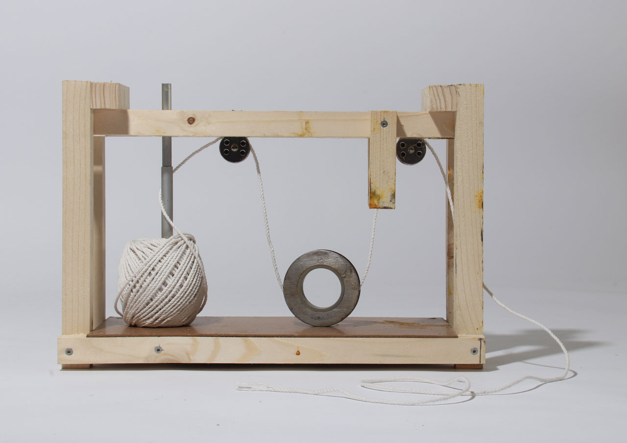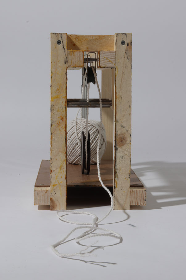 Dans le but de questionner les bienfaits et les avantages de l’autoproduction, j’ai travaillé un procédé d’empoissement de fil pour trouver un moyen de créer des volumes à partir de cordelette, à priori molle et sans tenue. Représentant pour moi un moyen de produire à volonté grâce à de faibles moyens économiques et matériels, j’ai orienté mes recherches sur un procédé qui reste au maximum naturel : de la corde de coton, de la colle à base de farine et de sucre, des pigments naturels tels que du charbon ou du curcuma.