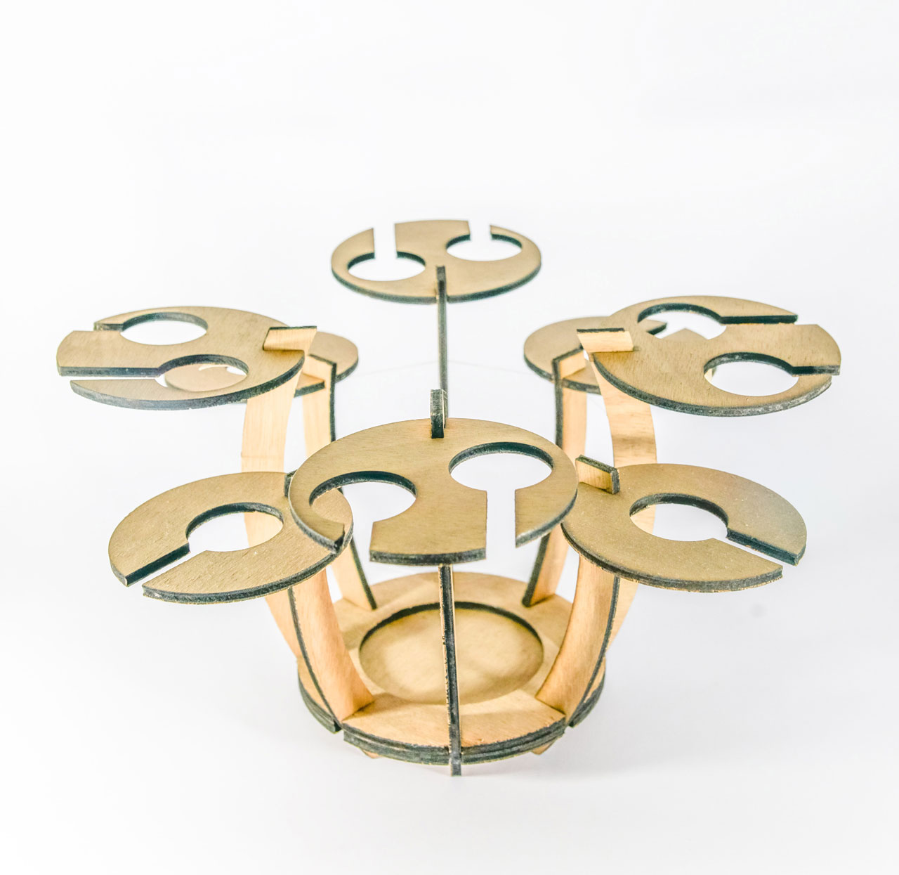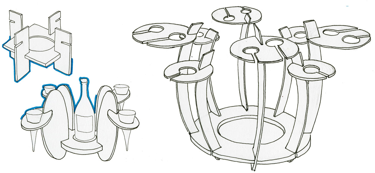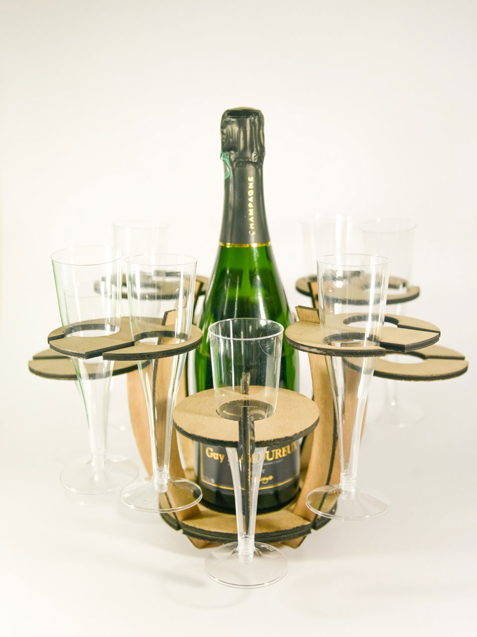 Champagne ! est un présentoir à champagne qui interroge les moyens de fabriquer un objet par un passage du plan au volume autour du thème des Arts de la Table.
